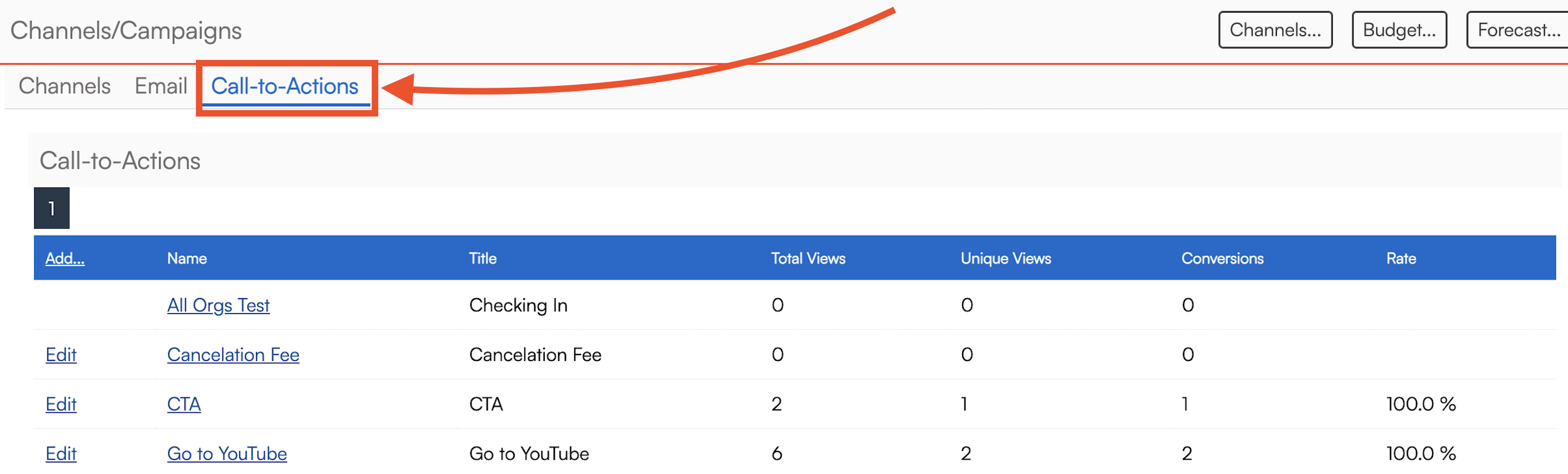 In the top menu, go to Control Panel > Campaigns and click the Call-to-Actions tab.