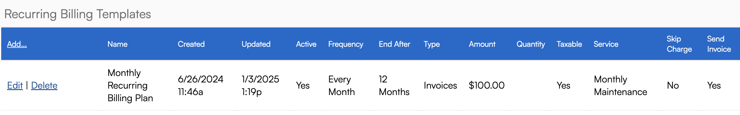 In Control Panel > Recurring Billing, you can create templates that define billing schedules for one or more services. Templates let you manage billing frequency, invoice type, and charge behavior in one place.