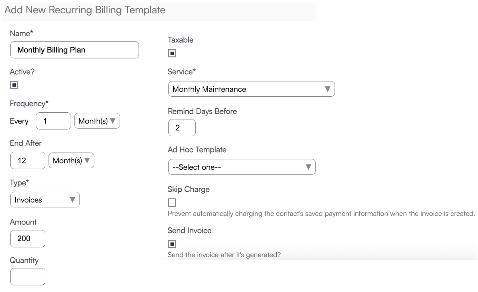 | Skip Charge | If checked, the system will not automatically charge the card on file. Instead, an invoice will be sent to the contact. |