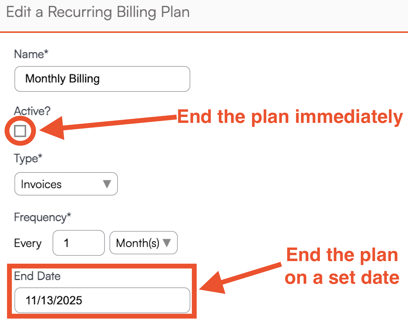 You can end a plan from either the contact’s record or the Recurring Billings grid.