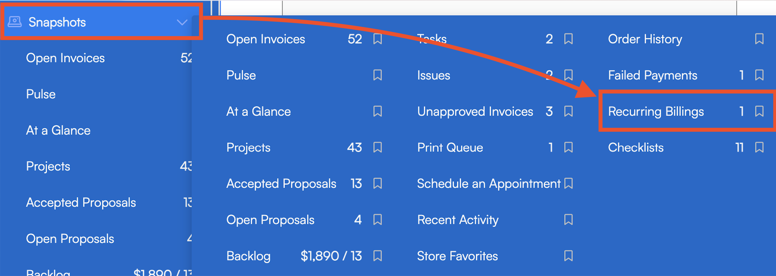 You can also review all active Recurring Billing plans via the Recurring Billings tab in the Snapshots section of the navigation menu. This snapshot will not display in the menu until after you've got at least one active Recurring Billing plan in your organization.