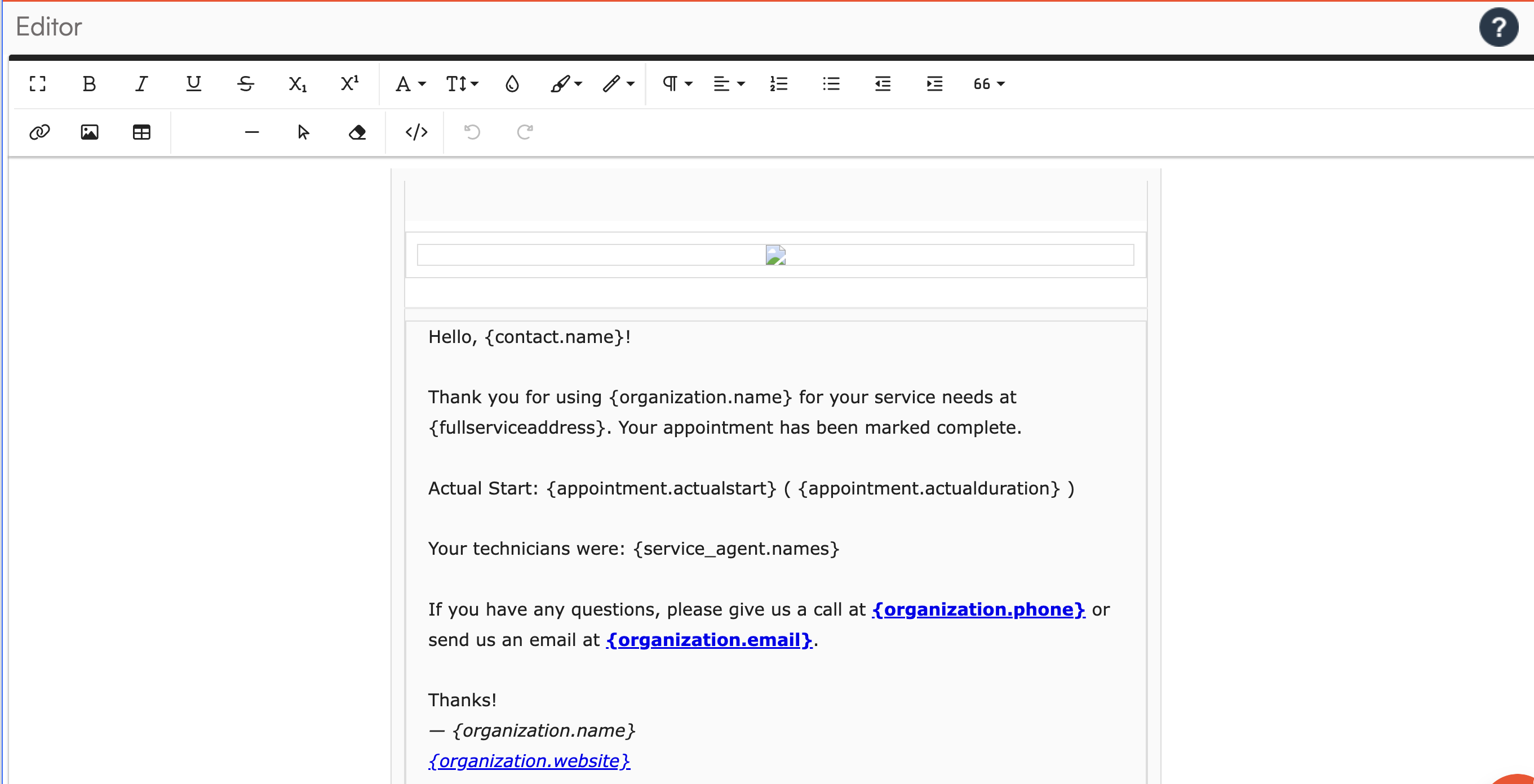 | Appointment Complete | This template is used for emails sent when an appointment is marked complete. This is different than the invoice, as the invoice may not be sent till the invoice is approved. As soon as an appointment is marked finished (typically by the Service Agent), this email will be sent.