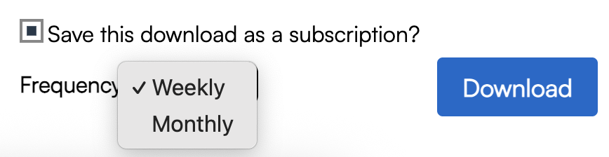 Once you are ready to initiate the download, you can also check the box to save those settings as a Download Subscription and choose if you want to receive it weekly or monthly. Downloads generated by Report Subscriptions are retained for 7 days.