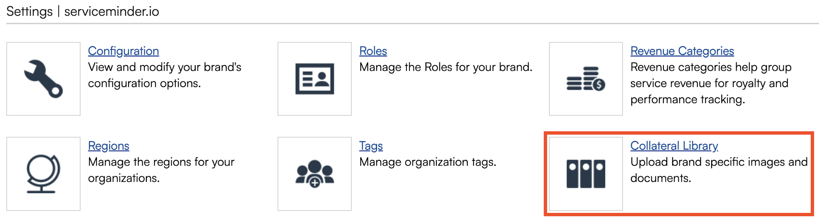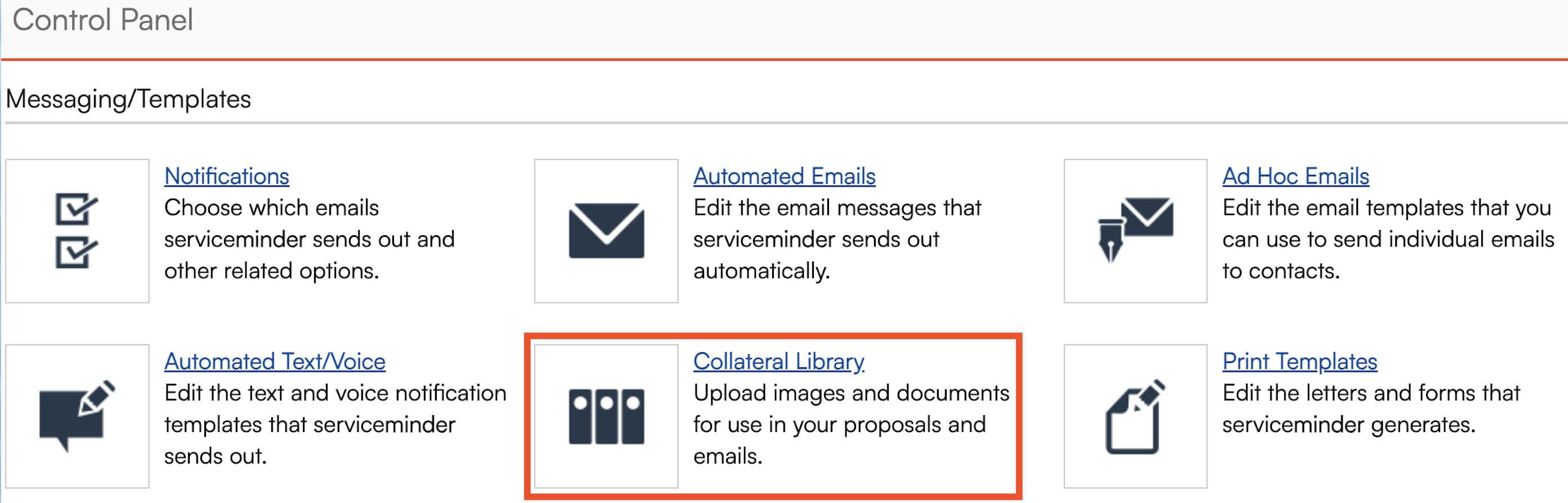 The Collateral Library is a place to store images and documents in serviceminder that you might use frequently. Think of it like Google Drive, but within the serviceminder system.