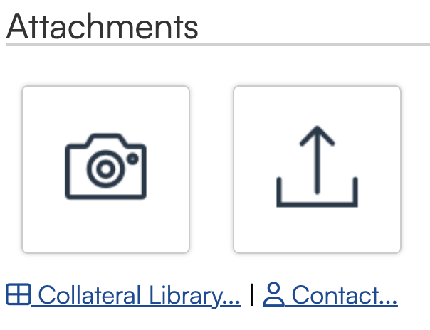 While you cannot directly attach a file to an email, you can use the Collateral Library to send files via link. When viewing the document in the Collateral Library, there is an option to copy a URL that leads to the document. This can be pasted in any communication to contacts.