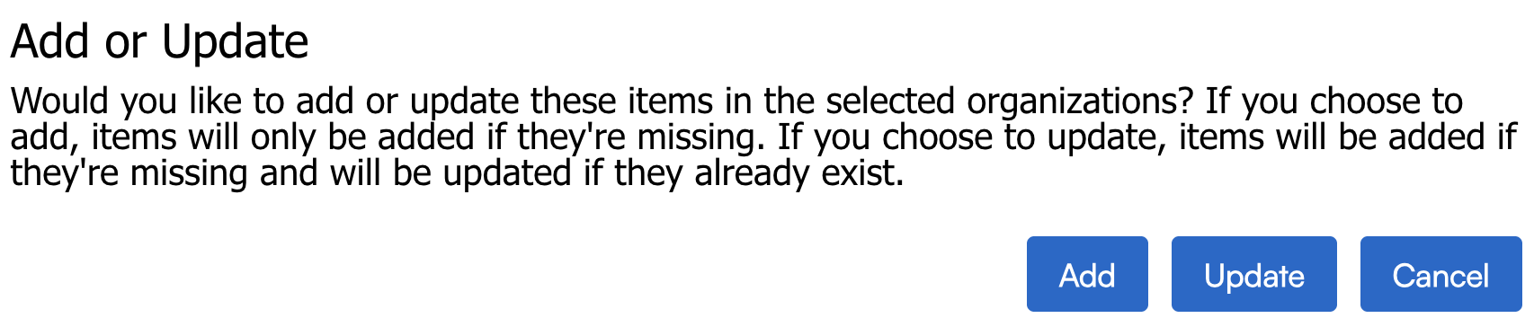 - Update means it will add to all orgs and overwrite any existing stuff if orgs are using the same name for that item (this is particularly tricky with Taskboards.)