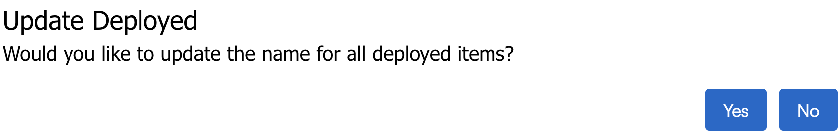 Once you have items deployed to your organizations, you may find a time where you need to update the name of one or more of those deployed items. For example, you may need to change the name of a custom field that all of your locations are using. You can edit that item in Control Panel, change the name, and click save. Upon saving you will be prompted to choose whether or not you want to deploy that name change out to all organizations that have that item.