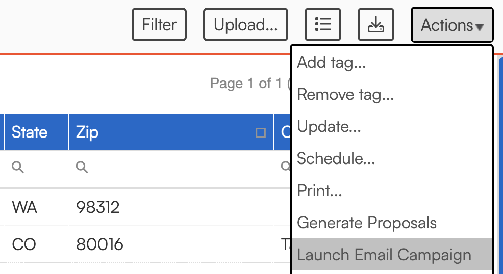 Once Email Campaigns are enabled for your account, you’ll see a Launch Campaign option in the Actions menu of several grids.