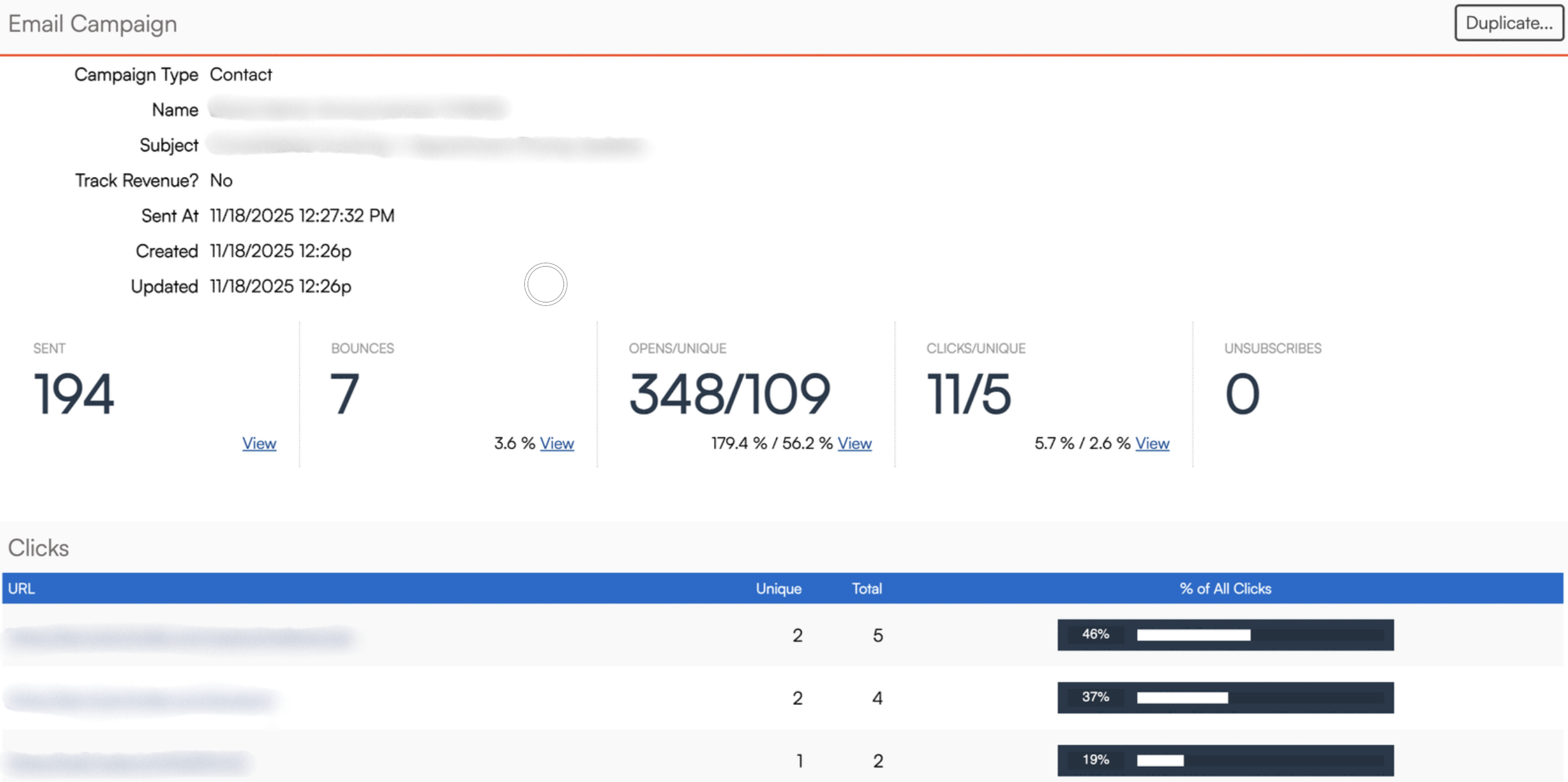 Tip: You can click the View link next to any metric to see a list of contacts that contributed to that stat—such as who clicked or unsubscribed.