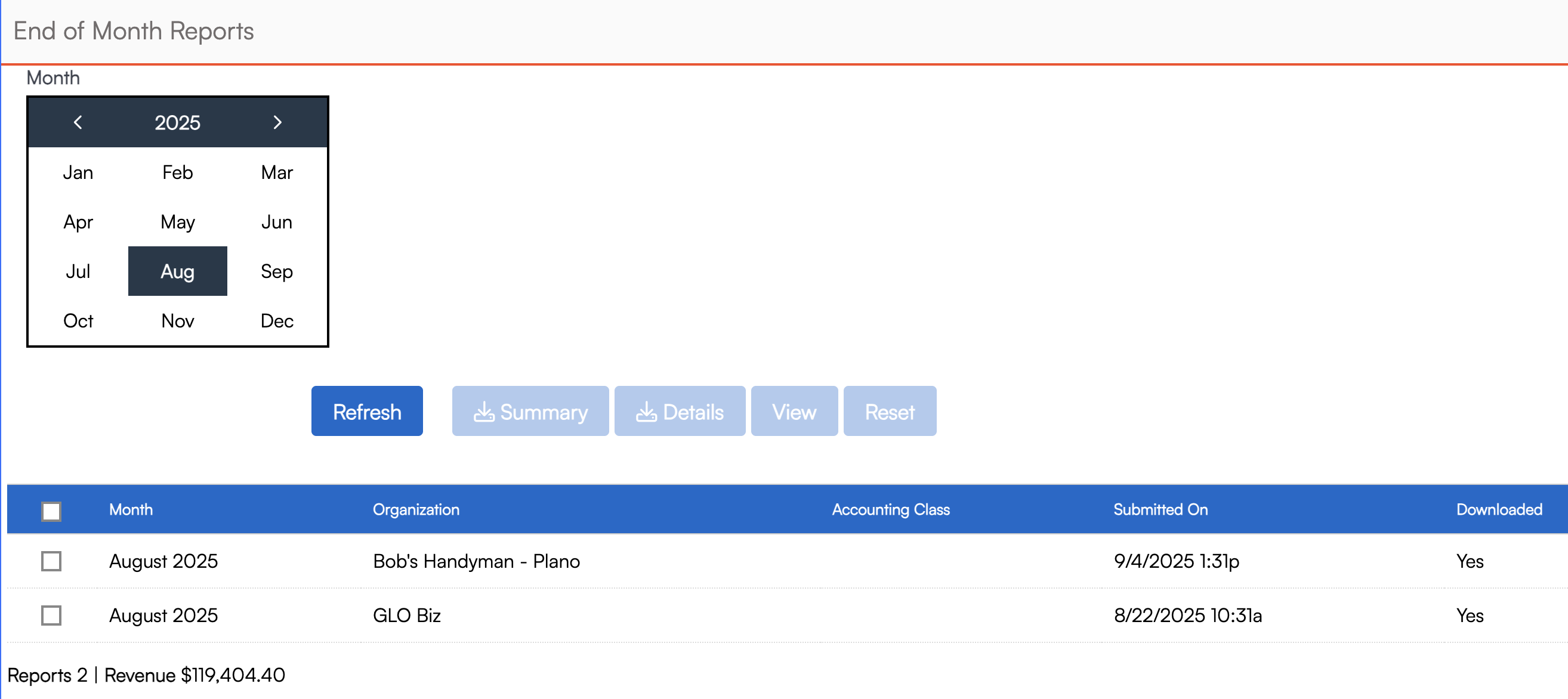 Franchisors (Brand Administrators) can access End of Period reports via Dashboard > Reports > End of Month.