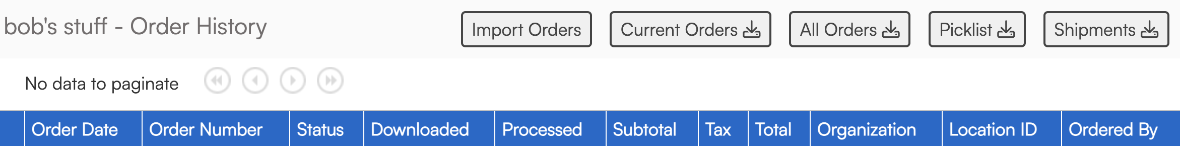 Buttons at the top of the page allow you to download CSV files of Current Orders, All Orders, Picklist, and Shipments. You can also import a file of orders into the system.