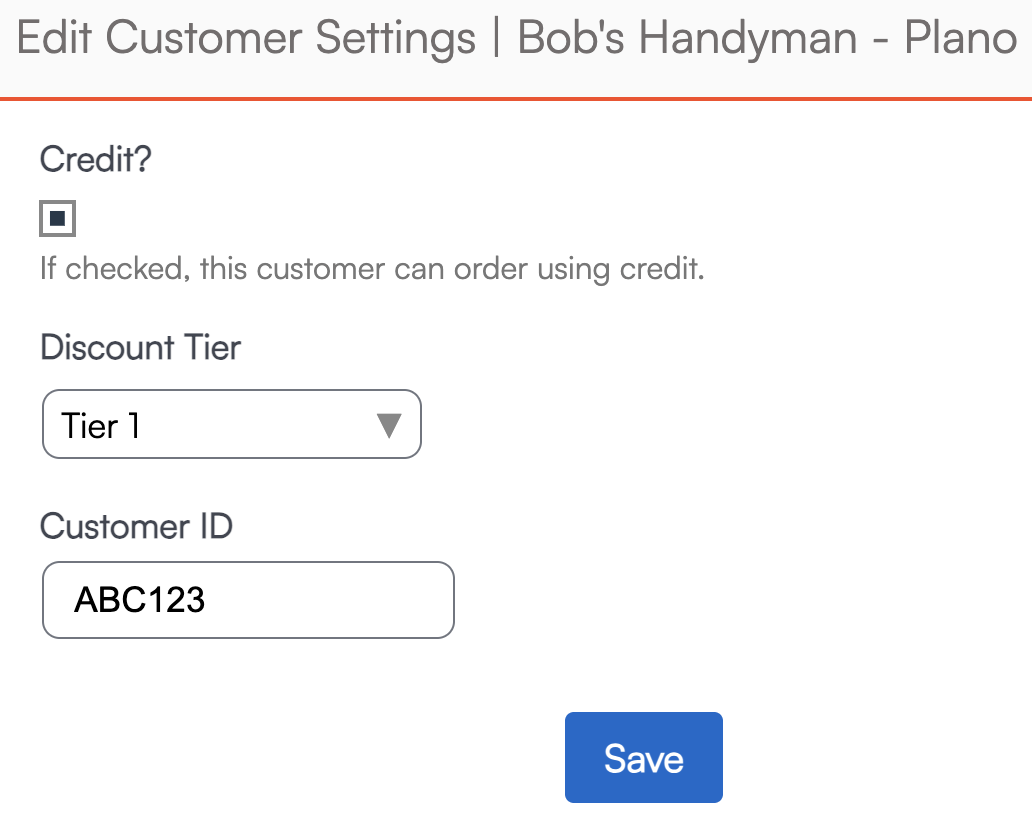 If you click Settings, you can apply special attributes to the org such as the Customer ID, if they can order using credit, and applying a discount tier.