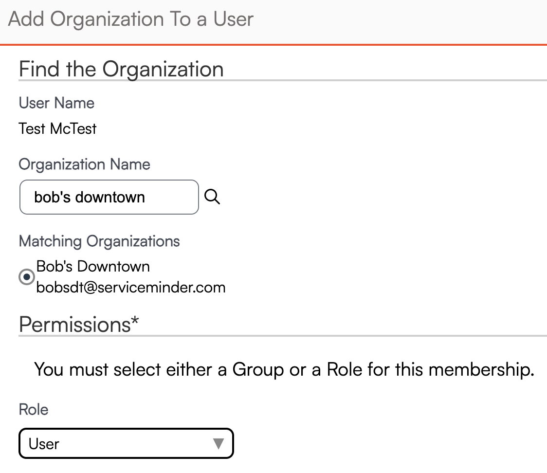 Select the organization you want to add this user to and assign them a User Role in that organization. If Permission Groups have been set up in this organization, you can also choose which group this user will belong to. This will automatically adjust their permissions in that specific organization. Users can have different permissions in different organizations, depending on their assigned group in each.