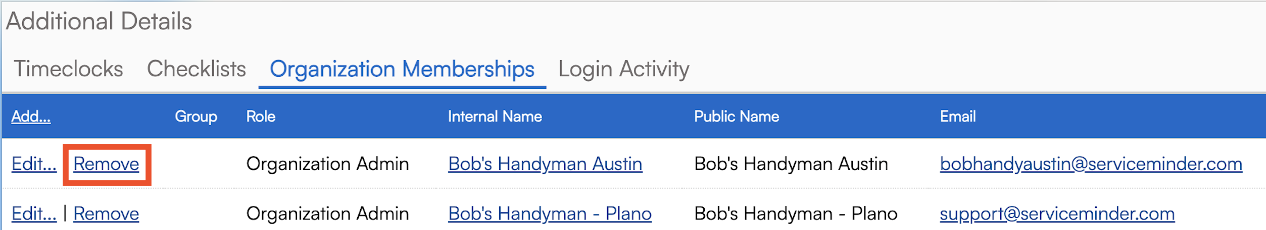 Once you have found a user within serviceminder, click on the Organization Memberships tab in the Additional Details section.