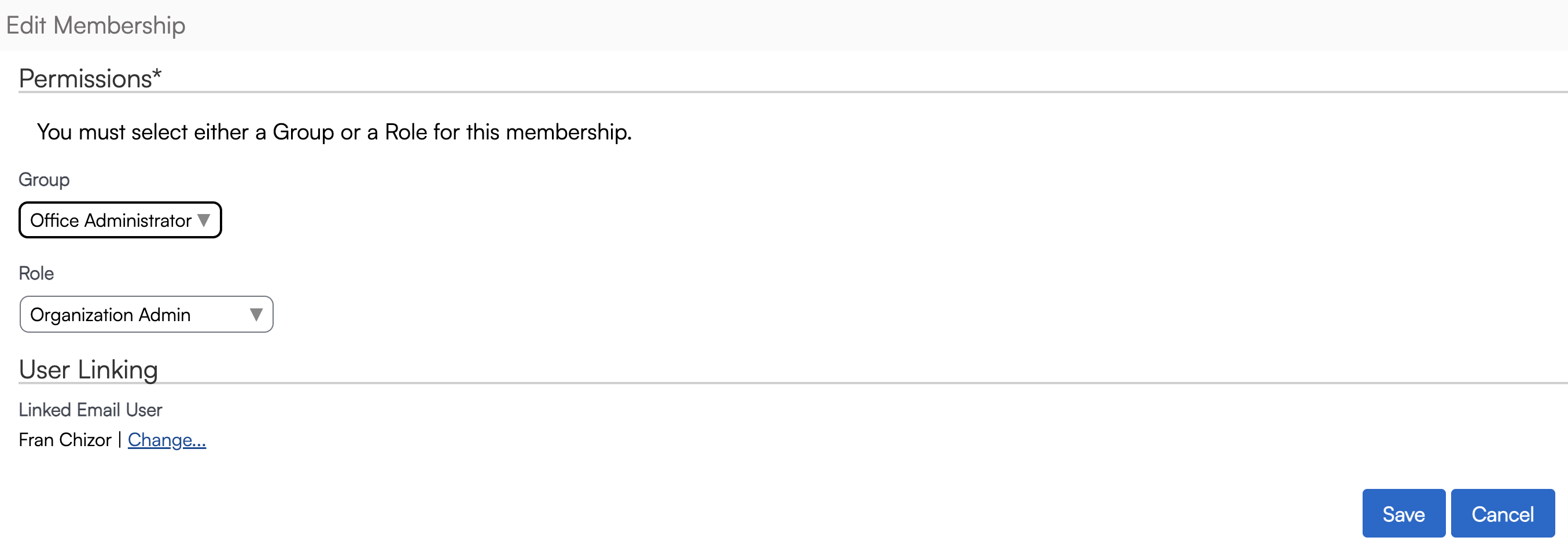 Clicking Edit will open up the options to change two factors of a user's membership within that organization.