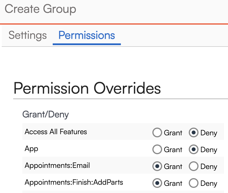 Then, you'll click the Permissions tab and grant or deny each permission.