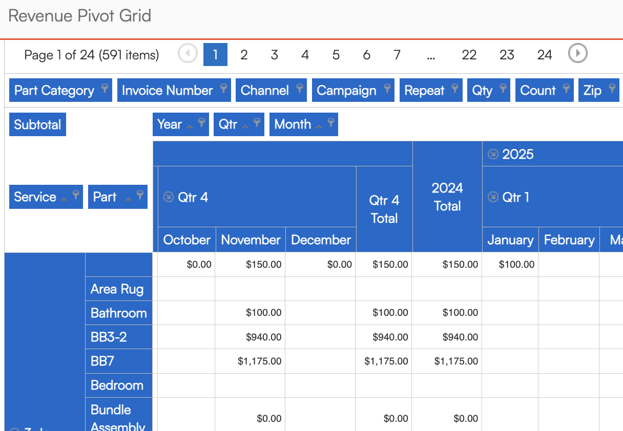 The Pivot Grid is a dynamic reporting tool in serviceminder that allows you to interactively analyze, filter, and group data. It's especially helpful for identifying trends and comparing key business metrics, such as: