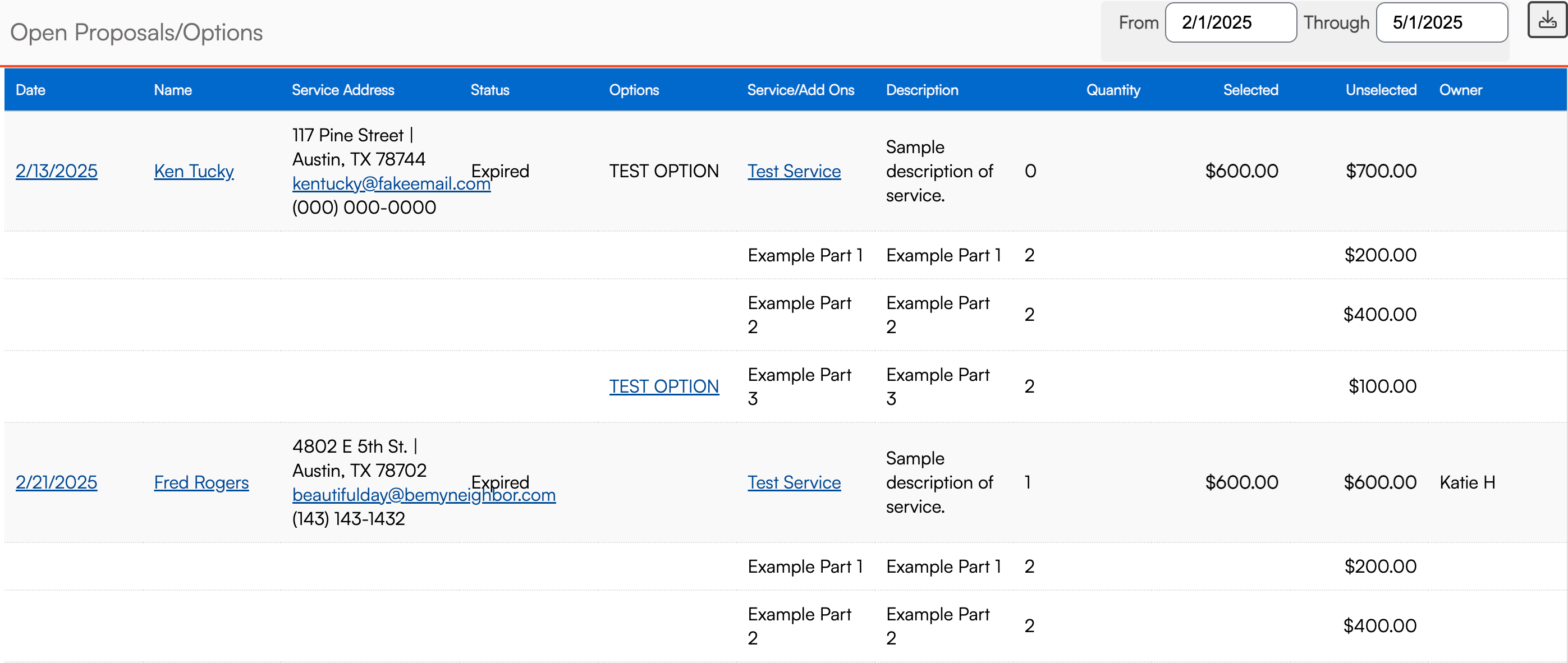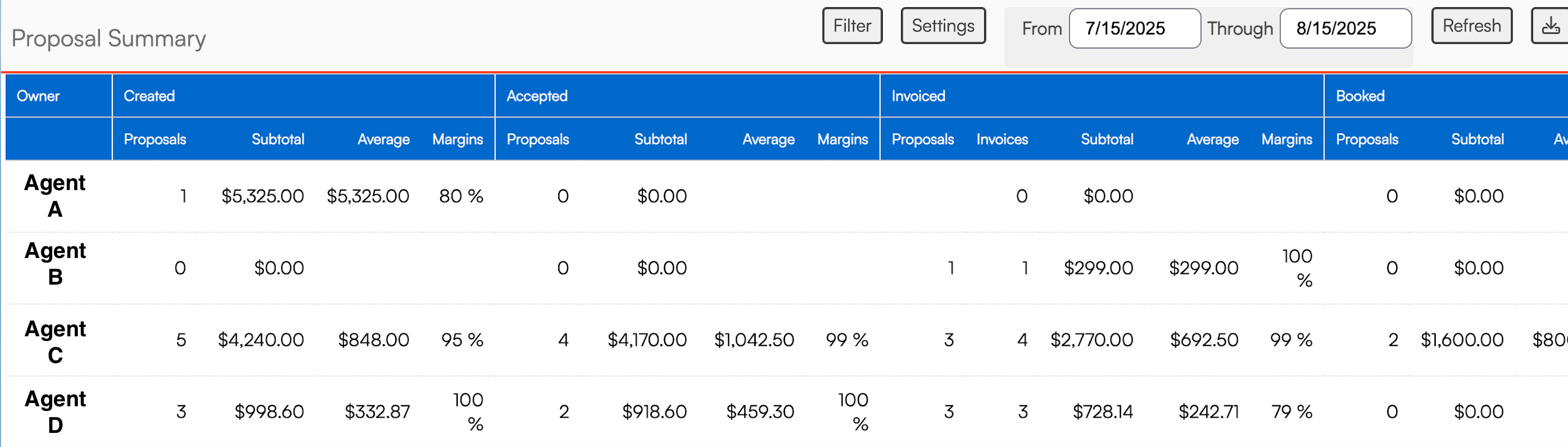 This report shows all Proposals created, accepted, invoiced, booked, and scheduled for a given date range. You can adjust the date range or filter based on additional criteria.