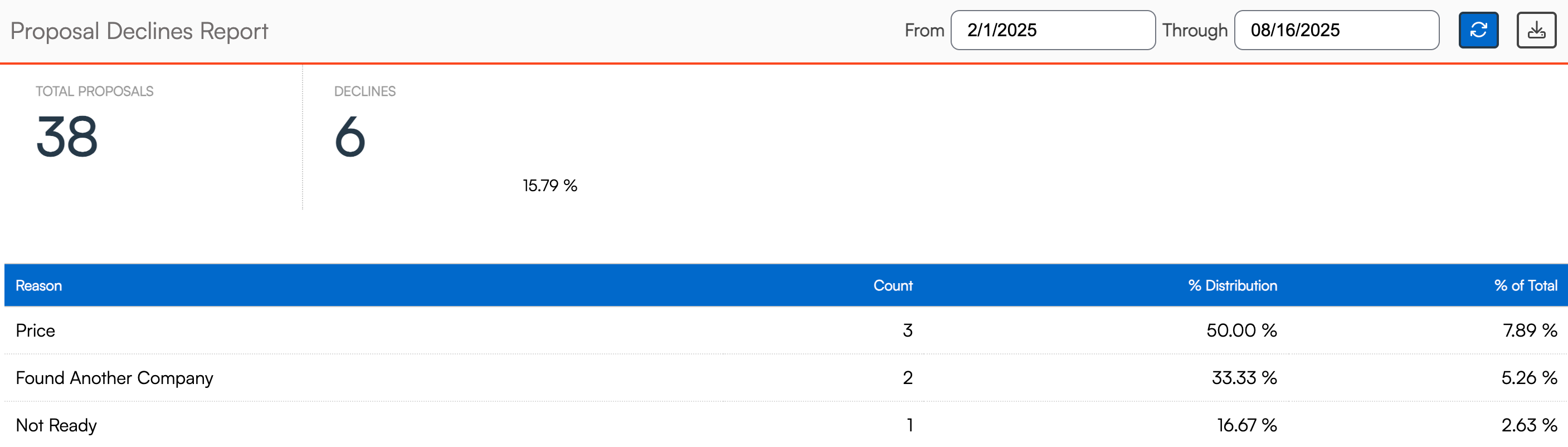 The Proposal Declines report provides a count of proposals that were created within a set date range and the number of proposals that were declined. This report helps identify common reasons for proposal declines and allows for better understanding and addressing of client objections.