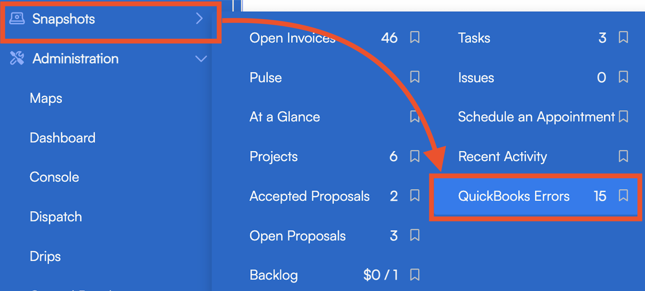 To first diagnose the issue, you need to view what the Error says. You can find a list of QuickBooks Errors in the navigation menu under Snapshots. If you don't have any errors, this will not show or you may see a count of 0.