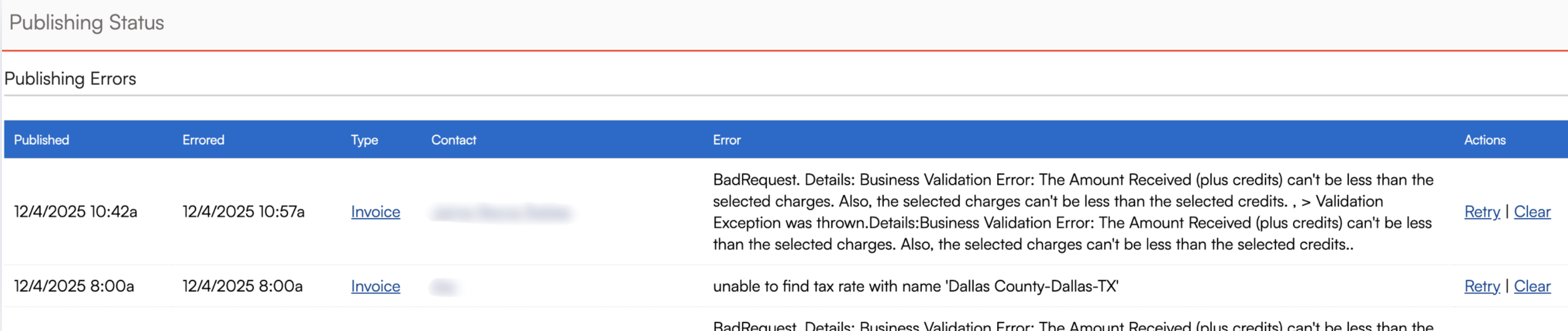 Clicking on the QuickBooks Errors snapshot will take you to the Publishing Status / Publishing Errors page. This grid provides details about the failed sync event, including:
