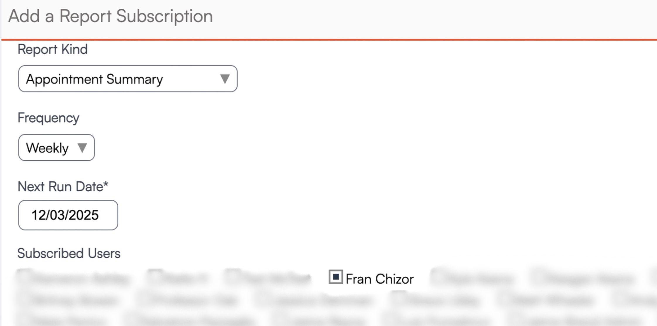 - Next Run Date: When you want the report to run next (it will run automatically at the set interval after that date).