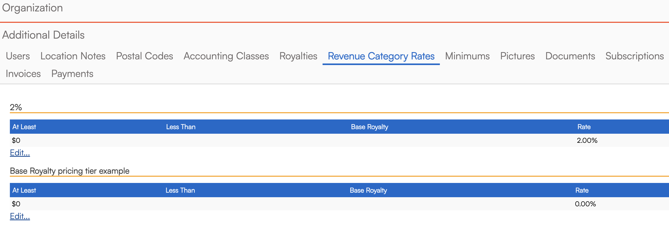 This is where your brand defines royalty settings such as minimums, maximums, variable percentages, and tiered royalties.