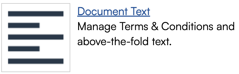 Settings for Terms and Conditions and Above the Fold Text can be found in Control Panel > Document Text.